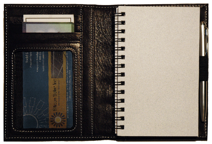 Description: Made of top-grain leather. Interior right side has a horizontal slit to hold a 3 x 4 inch notepad. Interior left side has three card slots and two pockets, plus an license ID holder. The outside back cover has a pocket holder for you business cards or receipts. Elastic pen loop. Mini gunmetal pen is included. 1/4 inch grid format notebook included.
